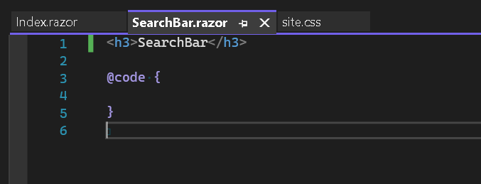 Now let's add the SearchBar component to Index.razor and run the application. Replace the boilerplate HTML code with the SearchBar component reference. If you are an angular developer, this should look familiar to you.