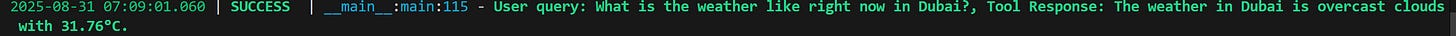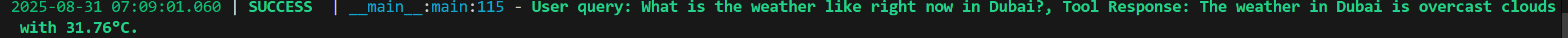 logger.success(f"User query: {query}, Tool Response: {result.content[0].text}")