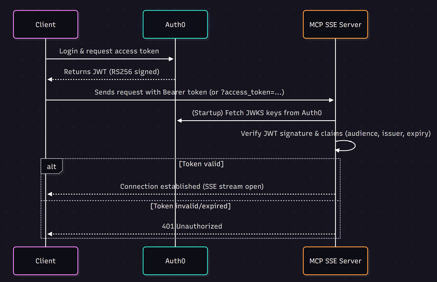 (RSA signature with SHA-256).JWKS Fetch: At startup, the server downloads Auth0’s public signing keys. These are later used to validate incoming tokens.