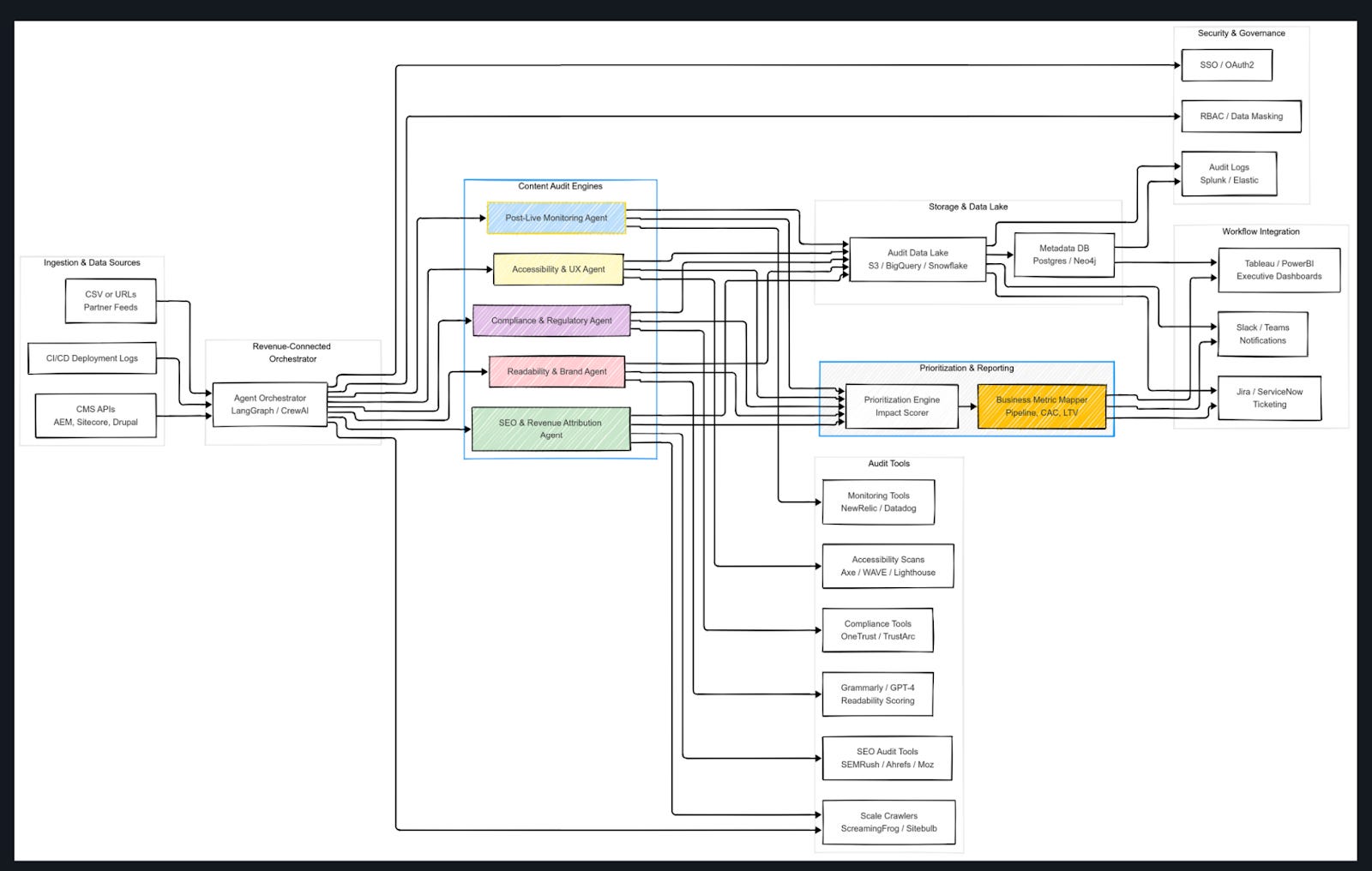 All results feed into secure databases that connect content to revenue and risk metrics. Finally, the prioritization engine turns data into business impact scores, triggering automated tickets and alerts so stakeholders can make fast, informed decisions.