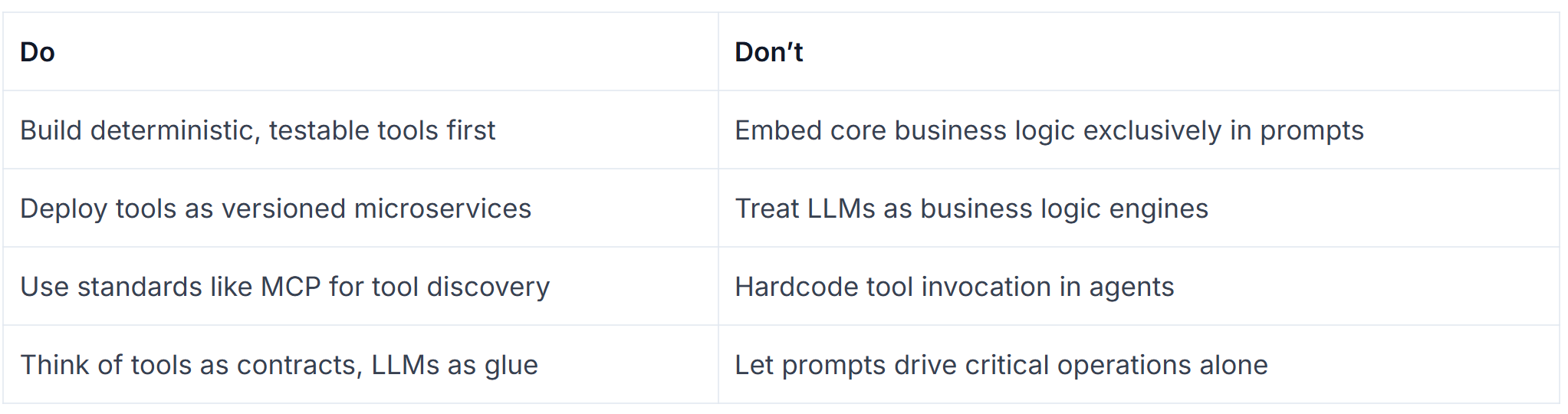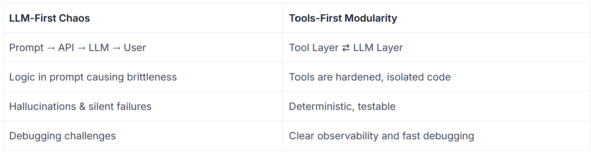 In modern AI agent systems, tools are code, LLMs are orchestration glue. Harden your tools first. Let LLMs coordinate. That’s how you build agents that scale, adapt, and never leave you debugging in the dark.
